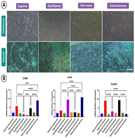 Chondrogenic induction of the r-AdMSCs isolated from diverse harvesting sites. (A) Representative light microscopic images of the third-passage cultured induced and uninduced cells for qualitative assessment of the chondrogenic differentiation. (B) Quantitative assessment of the chondrogenic induction genes Chondromodulin-1 (CHM1), Aggrecan (ACAN), and Collagen type 2 (Col2A1). Scale bar: 200 µm. Data were analyzed via one-way analysis of variance (ANOVA) followed by Tukey’s post hoc test and presented as mean ± SEM. *** p < 0.001 and **** p < 0.0001. The presented data are representative of four independent experiments.