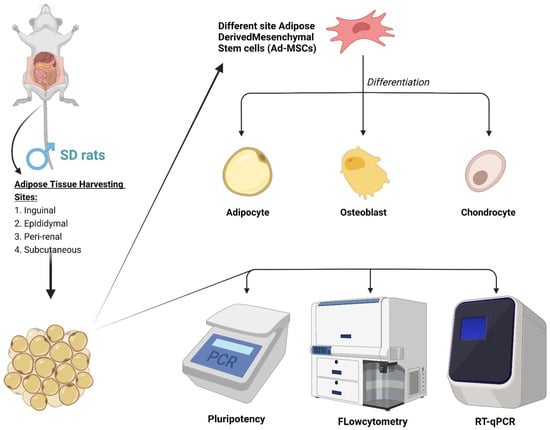 Schematic illustration of the present study design showing the isolation of the male Sprague Dawley (SD) rat adipose-derived mesenchymal stem cells (r-AdMSCs) from diverse fat depot harvesting sites followed by evaluation of the isolated cells using flowcytometry for immunophenotypic characterization of the isolated r-AdMSCs and PCR to qualitatively assess the expression of the pluripotent genes, and assessment of the differentiation potential of the isolated cells for adipogenic, osteogenic, and chondrogenic lineages’ induction both qualitatively, using specific stains, and quantitatively, using real-time qPCR.