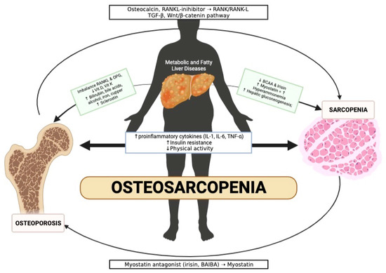 Chronic liver disease (CLD), including non-alcoholic fatty liver disease (NAFLD) and its advanced form, non-alcoholic steatohepatitis (NASH), affects a significant portion of the population worldwide. NAFLD is characterised by fat accumulation in the liver, while NASH is associated with inflammation and liver damage. Osteosarcopenia, which combines muscle and bone mass loss, is an emerging clinical problem in chronic liver disease that is often underappreciated. The reductions in muscle and bone mass share several common pathophysiological pathways; insulin resistance and chronic systemic inflammation are the most crucial predisposing factors and are related to the presence and gravity of NAFLD and to the worsening of the outcome of liver disease. This article explores the relationship between osteosarcopenia and NAFLD/MAFLD, focusing on the diagnosis, prevention and treatment of this condition in patients with CLD.