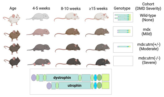 Murine models of DMD including the dystrophin-deficient mdx:utrn(+/−) mouse model used in this pilot study and the feasibility of modeling DMD symptom severity longitudinally with consideration for age-related effects.