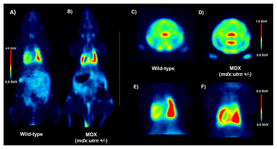 [18F]FEPPA SUV images of representative 8–10 week wild-type (A,C,E) and age-matched MDX dystrophy (B,D,F) mice. Coronal whole-body (A,B), axial whole brain slices (C,D), and heart images (E,F) were generated from PET time-activity curves at 30–60 min (n = 4–6 mice/genotype). MDX = dystrophin-deficient mdx:utrn(+/−) mouse model, SUV = standardized uptake values.