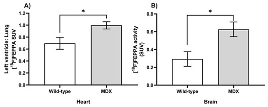 To assess the influence of inflammation on dystrophic cardiac and neural tissue, inflammation was quantified from the [18F]FEPPA PET images as mean standard uptake values (SUV). In the thoracic region, left-ventricle-to-lung mean SUV ratios indicated that MDX mice had significantly higher [18F]FEPPA uptake (Figure 4; t = 2.58, p = 0.0338), as these left-ventricle-to-lung ratios increased from 0.63 0.10 in WT mice to 0.99 ± 0.06 in the MDX cohort. In neural tissue, similar accumulations of inflammatory tracer were also observed in MDX mice. The WT brains demonstrated [18F]FEPPA uptake of 0.34 0.08 SUV, while MDX brains experienced 82.4% more uptake at 0.62 0.08 SUV.