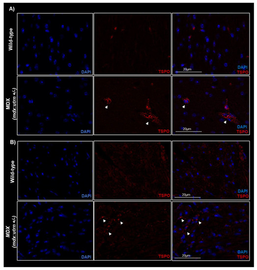 Ex vivo histology of TSPO-bound microglial and macrophages in an MDX and wild-type mice cardiac (A) and neural tissues (B). Representative fluorescence immunostained images of microglial and macrophages with TSPO (red) and DAPI (blue) in 8–10 weeks old mdx:utrn(+/−) mice depict qualitatively more prevalent TSPO expression in the dystrophin-deficient mice. White arrow heads indicate regions of TSPO signal. Scale bar overlaid on merged (DAPI and TSPO) images = 20 μm in length. Translocator protein, MDX = dystrophin-deficient mdx:utrn(+/−) mouse model.
