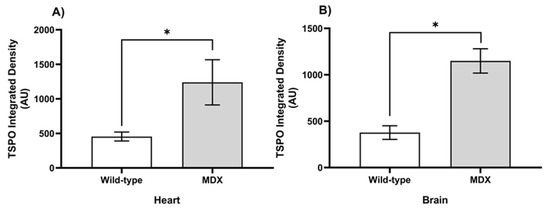 Quantified fluorescence immunohistochemical images of microglial and macrophages with TSPO in 8–10 weeks old MDX and wild-type subjects. Data (mean ± SE) depict higher TSPO in mdx:utrn(+/−) mice (gray bars) than wild-type controls (white bars) (n = 3 mice/genotype). Significant differences (p < 0.05), indicated by *, were observed for slices of cardiac (A) and neural (B) tissue when compared using Welch’s two-way t-test (n = 5–10 images/mouse/genotype). AU = arbitrary units. Other abbreviations as described in prior figures.