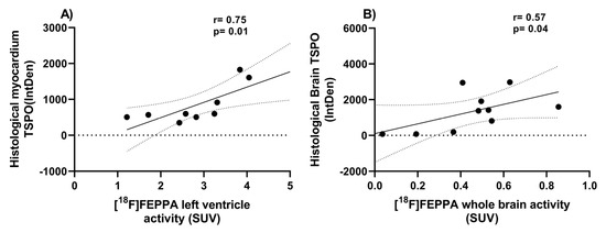Correlation of [18F]FEPPA activity with histological TSPO fluorescence intensity. Data depict the strong correlation of the left ventricle (A) or whole brain (B) PET avtivity, with quantified TSPO myocardium or neural tissue fluorescence signal. Pearson product-moment correlation coefficients (r) were calculated on all animals imaged with PET (n = 9 for heart association with 1 outlier excluded and n = 10 for brain associations, no outlier detected). Significance was considered when p < 0.05. IntDen = Integrated Density, the product of the mean fluorescence intensity and area of selected cell.