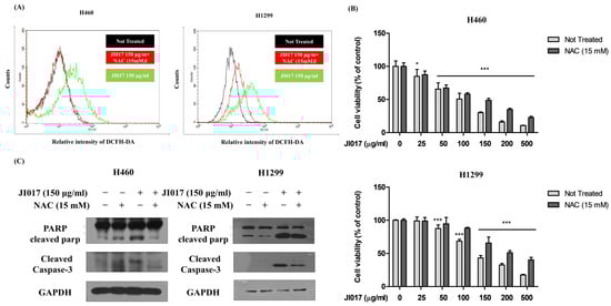 2.4. JI017 Induced Autophagy through Increased ROS Production in H460 and H1299 Cells