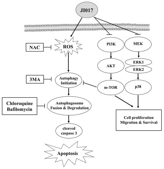 Ku JM, Kim MJ, Choi Y-J, Lee SY, Im J-Y, Jo Y-K, Yoon S, Kim J-H, Cha JW, Shin YC, et al. JI017 Induces Cell Autophagy and Apoptosis via Elevated Levels of Reactive Oxygen Species in Human Lung Cancer Cells. International Journal of Molecular Sciences. 2023; 24(8):7528. https://doi.org/10.3390/ijms24087528