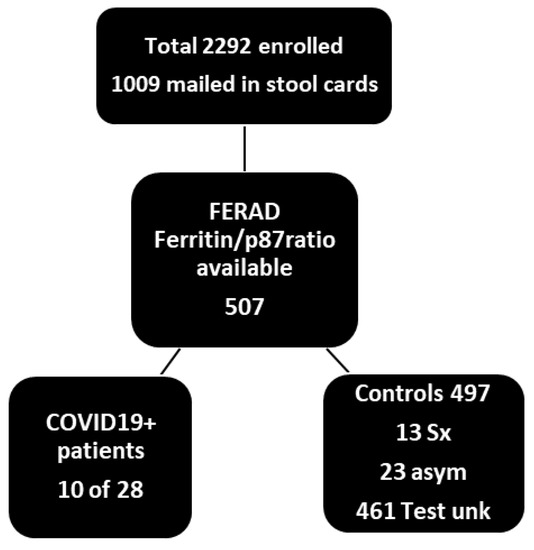Flow diagram of patients who submitted stool cards and had ferritin levels for a FERAD calculation. Less than 50% of patients turned in cards, and only 507 of those had ferritin concentration levels determined opportunistically and available from the computerized patient record system (CPRS). FERAD ratios in symptomatic (Sx) and asymptomatic (asym) patients totaled 36 and 461, where the results of a PCR COVID-19 test were unknown (unk). The proportion of stool cards delivered by postal mail was not substantially different from the known return proportion of 44% for occult blood card return, as determined for that time period at the Detroit VAMC.