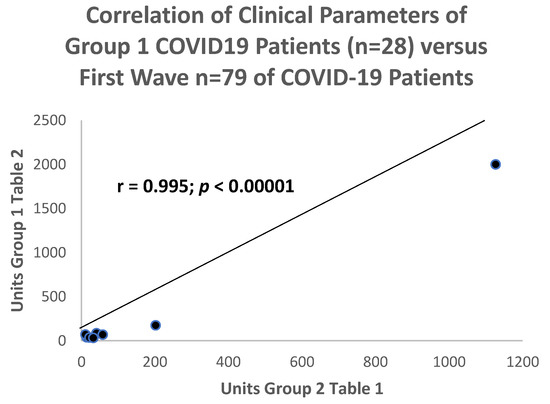 Despite the temporal differences between these 2 groups of COVID-19 patients, when the comparison data were correlated between the 2 groups, there was a convincing positive correlation with a correlation coefficient of r = 0.995 that was statistically significant at the p < 0.00001 level in Figure 2.