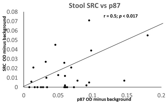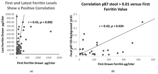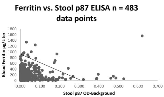 We also found a correlation between p87 and other indices of iron content, such as iron saturation (r = 0.5; p < 0.025, as depicted) confirming the importance of iron to the innate immune system. In contrast to the latter finding, there was no correlation between p87 and OSN, suggesting that they could represent different components of the immune system. In the surrogate group 3, there was an inverse correlation between the p87 ELISA and the ferritin (r = −0.1; p < 0.028), which was consistent with an inverse relation of the ferritin and ELISA p87 correlation (Figure 10) in this larger cohort. Since we had not correlated the Western blotting data on the stool, we could not determine the significance of this finding.
