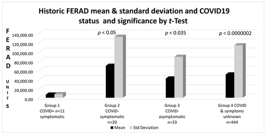 The mean FERAD ratio levels in Group 1 COVID-19+ patients were 6815 ± 7823 versus 69,575 ± 132,845 in Group 2 controls (p < 0.05); 14,608 ± 31,263 in the Group 3 patients with negative tests and no COVID-19 signs (NSS); and in Group 4, where there was no available information about tests or signs, FERAD differences were significant at 50,704 ± 114,298 (p = 0.000002). Data were available for 39% of the COVID-19 patients, 41% in (Group 2) controls, and 11% negative and 20% in the control (Group 3) and negative test (Group 4) groups, respectively. The results are depicted in Figure 4.