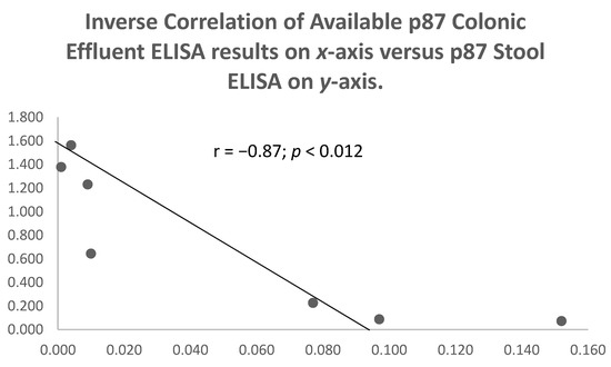 There were no correlations between p87 in the stool or the effluent in 245 paired samples (p = 0.91) for the quartiles, but there was an inverse relationship between these parameters in Group 2 patients, who were symptomatic but had COVID-19 negative tests (See Figure 6 above). No correlations were observed between the effluent p87 and the OSN ELISA results in 64 paired samples (p = 0.298) or the stool p87 and the OSN in 61 paired samples (p = 0.22). An inverse relation between the stool and the effluent p87 was observed (see Figure 7 below) in Group 2 patients (r = −0.87; p < 0.012).