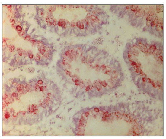 Photomicrograph ofAdnab-9 staining by immunohistochemistry in normal-appearing colonic mucosa. This photomicrograph with a particular magnification of 50×, in a normal colon biopsy section, showed the strong specific reddish-brown staining in the cytoplasm.
