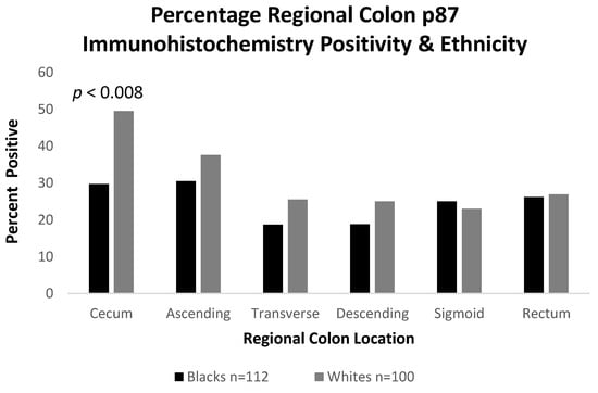 We endeavored to reveal the quantitative differences between these regions by ethnicity in 112 AA and 100 Caucasians. We found that although the right colon regions generally had an increased p87 expression, as compared to the left, the expression was statically significantly decreased in the ceca of AA (OR 0.43 [CI 0.24–0.78]; p < 0.008), as depicted in Figure 9. This likely reflected the distribution of the colonic Paneth cells in the two ethnic groups, which had been compared, and could have been linked to a JAK3 mutation more frequently found in African Americans [23].