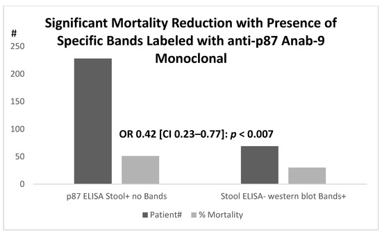 Focusing on the qualitative aspects of p87 in the surrogate database and the relation to the medications, whose efficacy was still unclear within the context of COVID-19, we summarized our approach. The first group for analysis was predicted regarding specificity, as we had postulated that veterans with distinct antigenic bands on Western blotting would reflect an intact immune system, as p87 was a Paneth-cell secretory product. A total of 69 patients had a negative ELISA, yet the specific bands were evident (WB+), and these were compared to the outcomes of 228 patient controls with positive ELISA results but with no detectable bands (as shown in Figure 11). Their mortality rates were lower in the WB+ than in the ELISA positive group (30 versus 51%, respectively; (OR 0.42 [CI 0.23–0.77]; p < 0.007). The Paneth cells also act as natural anti-microbials, and we had previously investigated one such entity, alpha-defensin 5 (aD5), that was often co-localized with p87 in various tissues and metaplastic epithelium [18]. This could play an extremely important role in COVID-19 viral infectivity, on which we elaborate in the discussion section. The overall mortality rates were higher, where specific p87 fecal bands were not detected.