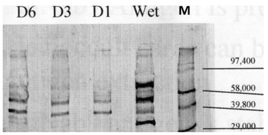 Western blot of stool with specific p87 bands and Molecular Weight Markers. Monoclonal antibody Adnab-9 that recognized p87 reacted in a Western blot of fecal samples. The blot showed positive bands with the relative mobility (M) molecular weight standards designated on the right. “Wet” represented a sample that had been freshly obtained and processed less than 24 h, being left at room temperature. D1, D3, and D6 were the sample stored at room temperatures for 1, 3, and 6 days, respectively. Paradoxically, while D6 appeared to have stronger bands, as compared to D1 and D3, the conditions of prolonged changes in the temperature and humidity could have caused these changes in the protein bands.