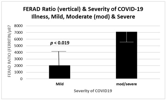 An important question to be answered was the ability of the FERAD biomarker to predict increased severity of the disease. Having discovered the relationship between the FERAD ratio and disease susceptibility, we focused on the possibility of predicting the overall mortality. We were careful to ensure that confounders, such as age, did not unduly affect our predictors and used quartiles based on the FERAD ratio to exclude the effects of confounders. We were able to show this (Figure 13) in our limited group of patients and, later, compare our biomarker with another previously published biomarker (see below). The mean FERAD was significantly reduced with mild disease (2039 ± 2382) versus moderate and severe cases (7114 ± 2017), with 4 patients in each group.
