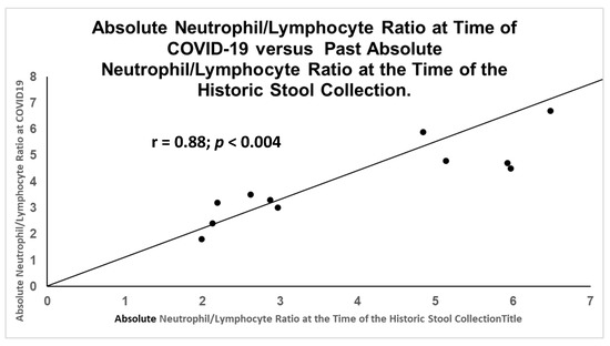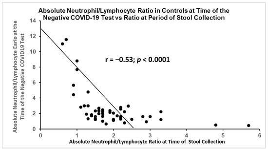 Figure 15 is a scattergram showing the same ratio of the absolute neutrophil/lymphocyte ratio measured at the time of a negative COVID-19 test, with the ratio at the time of the stool collection. It was statistically significant, but the correlation was inverse and opposite to that of patients with active COVID-19.