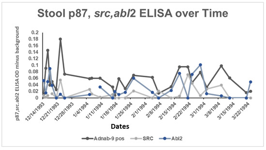 The ELISA was standardized for protein (5 µg/well), and Western blotting for specific bands was performed, as well as in the subset of patients who signed an additional Phase-2 consent for regional colonic biopsies, as described above, and subsequent immunohistochemical Adnab-9 labeling. The ELISA assay and Western blotting had been described in detail and published previously [11]. Briefly, microplate wells were instilled in duplicate wells with the stool extracts at 5 µg protein/50 μL PBS per well Primary Adnab-9 (previously available from DakoCytomation, Carpinteria, CA, USA). Anti-p87 monoclonal murine ascites was applied at a 1:500 dilution followed by secondary goat anti-mouse biotinylated antibody, followed by an avidin linker with alkaline phosphatase from a commercial kit (Vector Labs Inc., Burlingame, CA, USA) as part of a standardized kit and performed according to the manufacturer’s protocol. Antibody-bound antigen was detected with a pNPP (p-nitrophenyl phosphate solution—Sigma, Santa Fe, NM, USA), and the wells were read with a microplate reader at 405 nm wavelength (ThermoFisher Scientific Waltham, MA, USA). Control wells were treated with a primary anti-levan (plant carbohydrate) murine monoclonal antibody (UPC 10 Sigma Aldrich, St. Louis, MO, USA) of the same Ig2a isotype as Adnab-9. The assay reproducibility was highly specific even after a decade of −70 °C storage [15]. The data were expressed as OD-background/5µg protein. For the purposes of calculating the FERAD ratio, if the ELISA result was zero, we regarded it as 0.001 to be able to include these patients. Western blotting was likewise achieved using components of an immunoperoxidase kit using 3,3′,5,5′-tetramethylbenzidine (TMB) as substrate (ThermoFisher Scientific) using p87 isolated from pooled colorectal adenoma extract as the positive control in each procedure. Ten µg of protein sample were electrophoresed on a 9.6% sodium dodecyl sulfate-polyacrylamide gel and then transferred to PVDF membrane, after which Adnab-9 was applied in the ABC technique, as described above, to reveal specific bands, as compared to molecular weights standards run simultaneously to allow for determination of the relative mobility of the detected bands. An identical membrane was processed with an irrelevant monoclonal of the same isotype as Adnab-9 to ensure specificity. In the course of the characterization of the Adnab-9 monoclonal antibody, stool was collected from a healthy infant for 2 months. Amongst other markers, p87 binding was performed in the ELISA, as described above. Fortuitously, binding of other available antibodies now having COVID-19 relevance, Src and Abl, (antibodies were gifted by Dr. A. Majumdar), were also able to be performed. As described above, p87 Western blotting and ELISA of the adult and neonatal stool (obtained from a previous study) were performed.