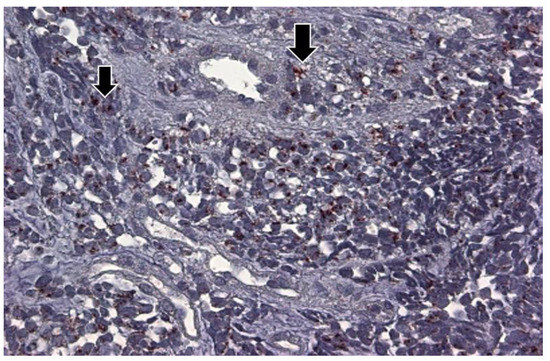 Over the course of conducting a study on the p87 stool tumor marker, which is known to be expressed in gut Paneth cells [25] and a component of the innate immune system, we included patients taking ACE-I or angiotensin-II receptor blockers (ARB) at the time of stool collection. We compared p87 and its broken-down products in the ACE-I (n = 196) and ARB (n = 9) groups (total subset, n = 205), as well as in the controls who had not been on either drug (n = 486). The demographics, as expected, showed older ages (age 65.6 ± 10.16 versus 61.03 ± 11.91 years, p < 0.0003) and predominantly male sex (91.7 versus 87.7%; p < 0.021), whereas African American patients were similarly distributed (51.2 versus 52.4%; p > 0.05) in the ACE-I/ARB group vs. controls, respectively. Diabetes was more common in patients taking ACE-I/ARB than in controls (51.2 versus 31.8%; OR 2.25 (1.61–3.14), respectively; p < 0.0001). The stool ELISA for p87 was positive in 24.5 in ACE-I/ARB versus 23.1% in controls (not statistically significant, NSS). Similarly, the more specific Western blotting for all moieties of p87 was 8.9% for ACE-I/ARB versus 13.7% control patients (NSS). In contrast, when considering the more ubiquitous p30 moiety, the proportions were statistically significant (OR 0.43 (0.21–0.89); p < 0.021) with positive results in only 5.4% of ACE-I/ARB patients (9 positive, 159 negative) versus 11.7% of controls (48 positive, 362 negative). Since p87 could also be used as a tumor marker and could have been a confounding variable, we also compared the cumulative adenoma numbers in both groups and found that they did not differ (1.94 ± 2.97 in ACE-I/ARB versus controls 2.15 ± 3.64; p > 0.05). It was suggested that calcium channel blockers (CCB) could be substituted for ACE-I/ARB for some conditions in individuals at high risk of COVID-19 since they were not known to increase ACE2 [26]. As compared to the p30 proportion of total p87 fecal bands in the Western blotting (see Figure 12 above), the CCB patients had 12.1% versus 13.1% in controls (NSS), suggesting an absence of discernable immunosuppression. Notably, p87 immunostaining was found in the lung tissue as well as the bowel (Figure 18).
