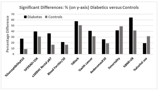 Comparatively few of the 2 small patient clinical populations sampled had turned in stool samples: 44% from COVID-19 group versus 46% from the controls. Despite this limitation, it was found that the historic values of ferritin were significantly higher in those destined to have the disease, as compared to those who did not (420 ± 84 versus 122 ± 173 ng/dL; p < 0.018). The ferritin in patients with diabetes was similar. Specifically, the initial historic blood ferritin levels were correlated with last drawn levels in 56 patients, as shown in Figure 3a, with r = 0.41 (p < 0.002).