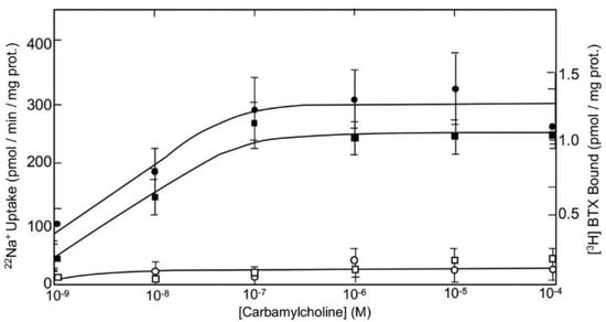 The effect of membrane potential on different receptors in synapses was examined in synaptoneurosomes [,,,,]. In these experiments, binding of cholinergic agonists to muscarinic receptors induced a Tetrodotoxin (TTX)-sensitive 22Na+ uptake, which was blocked by the muscarinic receptor antagonist atropine (Ref. []; Figure 1). In addition, specific binding of toxins to sites in the open configuration of VDSC, including the specific binding of labeled Batrachotoxin ([3H]BTX), was induced at resting membrane potential by the binding of cholinergic agonists to muscarinic receptors in the synaptoneurosomes. Their displacement by atropine prevented the induced [3H]BTX binding by muscarinic agonists (Refs. [,]; Figure 1).