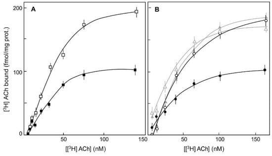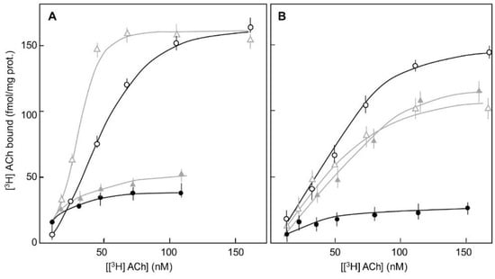 ). [3H]Ach binding measured in untreated synaptoneurosomes (black lines, circles) and in synaptoneurosomes treated (grey lines, triangles) with the S-enantiomer of DPI (5 µM) in the presence of 1 µM TTX (A) or with the R-enantiomer of DPI (5 µM) (B), are presented. The non-specific binding of [3H]ACh was measured in the presence of 1 µM atropine. (Ref. []).