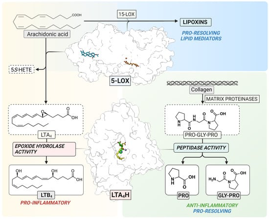 The 5-LOX pathway. 5-LOX catalyzes the oxygenation of arachidonic acid to 5S-HETE and the LTA4 epoxide as the substrate for LTA4H. In parallel, 5-LOX contributes to the formation of lipoxins in cooperation with 15-LOX (top). LTA4H catalyzes the conversion of unstable LTA4 to LTB4 (left) or the cleavage of a neutrophil chemoattractant, Pro-Gly-Pro (right). The structure of 5-LOX has been elucidated with two inhibitors, NDGA (orange) in the catalytic center containing non-heme iron (red) and AKBA (blue) inside an allosteric pocket between the β-barrel and catalytic domain, respectively. The structure of LTA4H contains overlapping binding sites for LTA4 (yellow) and Pro-Gly-Pro (green) which interact with the catalytic zinc (purple).