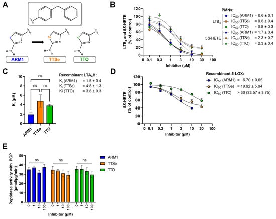 Inhibition assays with chalcogen-containing inhibitors. (A) The chemical structures of inhibitors: ARM1, TTSe and TTO; (B) The IC50 values of chalcogen-containing inhibitors determined based on the cellular activity of LTA4H and 5−LOX in activated polymorphonuclear neutrophils (PMNs) (C) The inhibition constants (Ki) of inhibitors determined with recombinant human LTA4H; (D) The IC50 values of inhibitors with recombinant human 5−LOX; (E) The effect of inhibitors on the aminopeptidase activity of LTA4H with the PGP substrate. ns—non−significantly different values.