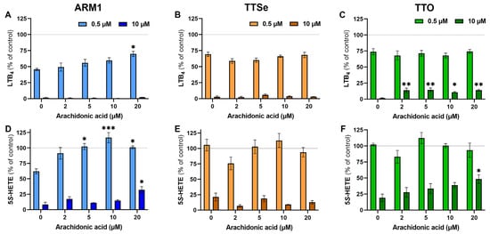 The effect of arachidonic acid at different concentrations on the potency of inhibitors. (A–C) The levels of LTB4 were determined from intact PMNs treated with 0–20 µM of arachidonic acid in the presence of 0.5 µM or 10 µM of ARM1, TTSe or TTO. (D–F) The levels of 5S-HETE were determined in parallel. Statistically significant values were derived in comparison with the control value in the absence of exogenous AA. * p value < 0.05; ** p value < 0.01; *** p value < 0.001; non-significant differences are not indicated.
