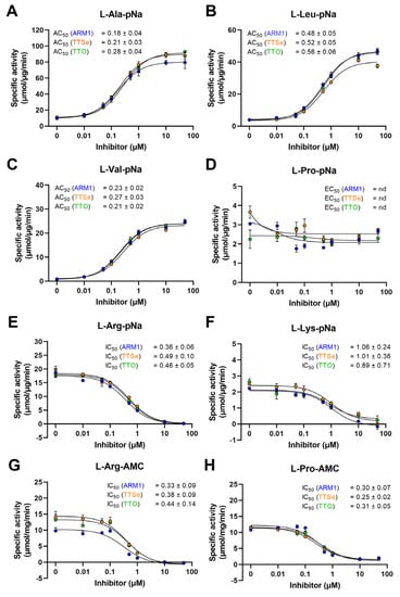 Based on the peptidase assay with LTA4H and different peptide analogues, the effective activating or inhibiting concentrations, the AC50 or IC50 values, for ARM1, TTSe and TTO were calculated (Figure 4). The lowest AC50 values were determined with L-Ala-pNa and L-Val-pNa substrates. The peptidase activity was inhibited with L-Arg-pNa, L-Arg-AMC and L-Pro-AMC substrates. The AC50/IC50 values with L-Pro-pNa were not determined due to the apparent effect of inhibitors (Figure 4D).