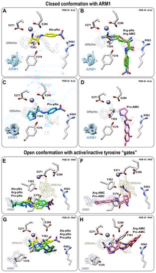 Peptide analogues docked into LTA4H or the ARM1-bound LTA4H. (A−D) Binding modes of Ala−pNa (yellow, A), Arg−pNa (green) or Arg−AMC (pink, B), Pro−pNa (blue, C) or Pro−AMC (pink, D) in LTA4H bound with ARM1 (PDB ID: 4L2L); (E,F) The binding mode of Ala−pNa, Arg−pNa, Pro−pNa (E) and Arg−AMC, Pro−AMC (F) in LTA4H D375N in an open conformation with inactive (E,F) or active (G,H) tyrosine “gate”.
