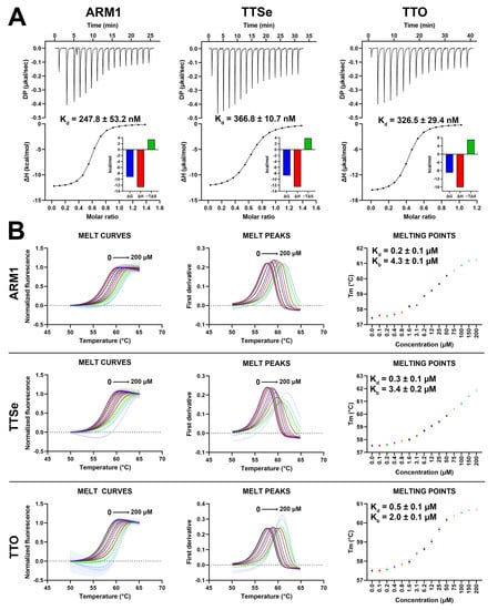 Based on isothermal titration calorimetry (ITC) measurements, ARM1, TTSe and TTO possess similar binding parameters (Figure 6A). The dissociation constants (Kd) for ARM1, TTSe and TTO were determined as 0.25, 0.37 and 0.33 µM, respectively, which is in correlation with previous reports for ARM1 [].