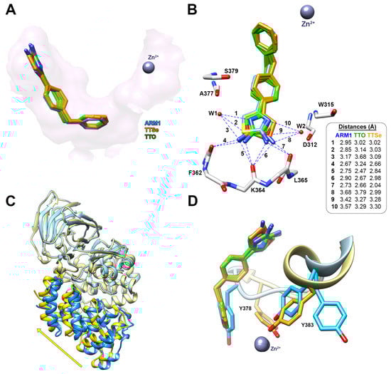 The binding mode of TTSe and TTO in LTA4H. (A) TTSe (orange), TTO (green) and ARM1 (blue) are bound to the end of the substrate channel of LTA4H; (B) Distances of hydrogen bonds between inhibitors, the polypeptide chain of LTA4H and water molecules (W1 and W2); (C) The domain movement from open (blue; PDB ID: 5NIA) to closed conformation (yellow) induced by selective inhibitors; (D) the inhibitor-induced rotation of Y378 and Y388 into the activated state of LTA4H.