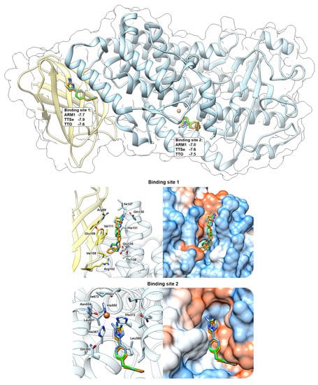 In silico prediction of the interaction between chalcogen−containing inhibitors and 5−LOX. ARM1 (blue), TTSe (orange) and TTO (green) were docked to the pocket between the C2−like domain (yellow) and the catalytic domain (blue) (Binding site 1) and inside the catalytic center (Binding site 2). Docking simulations were carried out with the AlphaFold−generated 5−LOX and uncorked 5−LOX (PDB ID: 6N2W) and the binding scores for each inhibitor were determined (top panel).