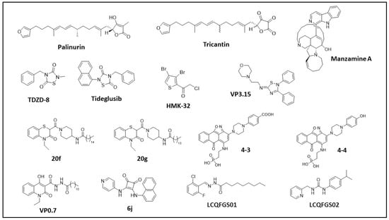 - Roca, C.; Campillo, N.E. Glycogen Synthase Kinase 3 (GSK-3) Inhibitors: A Patent Update (2016–2019). Expert Opin. Ther. Pat. 2020, 30, 863–872. [Google Scholar] [CrossRef]