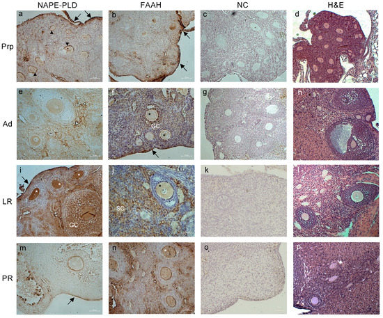 Representative images of tissue localization of NAPE-PLD and FAAH in mice ovaries during reproductive aging. Representative images of NAPE-PLD (a,e,i,m) and FAAH (b,f,j,n) immunoreactivity in prepubertal (PrP), adult (Ad), late reproductive (LR), and post-reproductive (PR) mouse ovaries. Negative controls (NC; (c,g,k,o)) and H&E staining (d,h,l,p) are also presented. Annotations and abbreviations—Arrows: ovarian surface epithelium; arrowheads: interstice granulosa cells–oocyte; asterisks: oocytes; GC: granulosa cells; SC: stroma cells. Scale bar: 50 µm. Magnification: ×200.