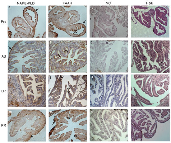 Representative images of tissue localization of NAPE-PLD and FAAH in mice oviducts during reproductive aging. Representative images of NAPE-PLD (a,e,i,m) and FAAH (b,f,j,n) immunoreactivity in prepubertal (PrP), adult (Ad), late reproductive (LR), and post-reproductive (PR) mouse oviducts. Negative controls (NC; (c,g,k,o)) and H&E staining (d,h,l,p) are also presented. Annotations—Arrows: serosa; circle: secretory cells; asterisks: ciliated cells. Scale bar: 50 µm. Magnification: ×200.