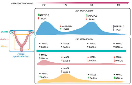 Schematic representation of age-related modulation of ECS in the female reproductive tract. A similar regulation of AEA metabolic enzymes is apparent in all organs (blue curve), whereas 2-AG metabolism seems to be differentially affected in an organ-specific manner (green: ovary, pink: oviduct, yellow: uterus). Abbreviations and annotation: Ad: adult; DAGL-α: diacylglycerol lipase α; FAAH: fatty acid amide hydrolase; LR: late reproductive; MAGL: monoacylglycerol lipase; NAPE-PLD: N-acylphosphatidylethanolamine-specific phospholipase D; PR: post-reproductive; PrP: prepubertal; pink arrow: reproductive aging timeline; green arrow: upregulation; red arrow: downregulation; =: unchanged.