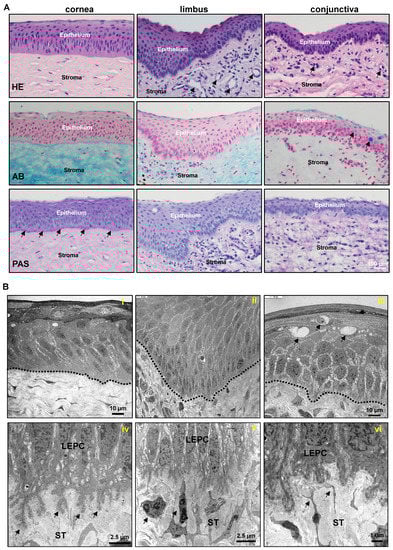 Histology of porcine ocular surface: (A) Light micrographs of paraffin sections of corneoconjunctival tissue stained with hematoxylin and eosin (HE) showing the corneal epithelium consists of 6–8 layers of stratified epithelium and Bowman’s layer is not evident; deep invaginations of the limbal epithelium (6–12 layers) analogous to the limbal interpalisade crypts of human limbal tissue can be observed in the limbal zone; the bulbar conjunctiva is composed of a 3–5 layered stratified epithelium; significant vessels (arrows) in the limbal and conjunctival stroma. The conjunctival and limbal stroma are organized differently to the corneal stroma, with loose connective tissue, a large number of fibroblasts, and the significant presence of vessels (arrows). Alcian blue (AB) staining of ocular surface showing the presence of glycosaminoglycans (blue) throughout the cornea and rather weak staining in the limbal and conjunctival stroma and the presence of goblet cells in the conjunctival epithelium (arrows). Periodic acid-Schiff (PAS) staining highlighting the BM of porcine corneal epithelium (arrows) and less pronounced in the epithelial BM of limbus and conjunctiva. (B) Transmission electron micrographs showing the architecture of the corneal (i), limbal (ii), and the presence of goblet cells in the conjunctival epithelia (arrows, (iii)) (dotted line represents basement membrane); extensive basal cell processes of limbal epithelial progenitor cells (LEPC) extending into the limbal stroma (ST) (arrows, (iv)), close interactions with stromal immune cells (arrows, (v)) and with mesenchymal stromal cells (arrows, (vi)).