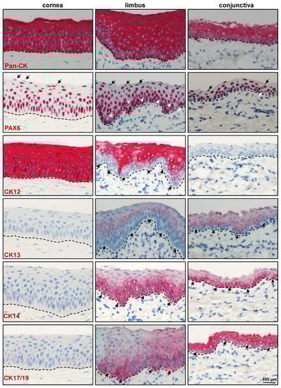 Immunohistochemical analysis of epithelial-related markers: Immunohistochemical staining of paraffin sections showing the expression of epithelial keratins (pan-CK) in all epithelial layers of the cornea, limbus, and conjunctiva (red); PAX6 expression in all layers of corneal epithelium and in nearly all epithelial cell layers of limbus and conjunctiva except for some basal cells (white arrows) and superficial epithelial cells (black arrows); cytokeratin (CK) 12 expression in all layers of the corneal epithelium, but only in suprabasal cell layers of limbal epithelium (arrows); CK13 expression in the suprabasal cell layers of both limbal and conjunctival epithelium and negative in the basal layers (arrows); CK14 expression in the basal layers of the limbal and conjunctival epithelia (arrows) but negative in the corneal epithelium; and CK17/19 expression in basal layers of the limbal epithelium (arrows) and in all layers of the conjunctival epithelium (arrows); dashed line represents basement membrane.