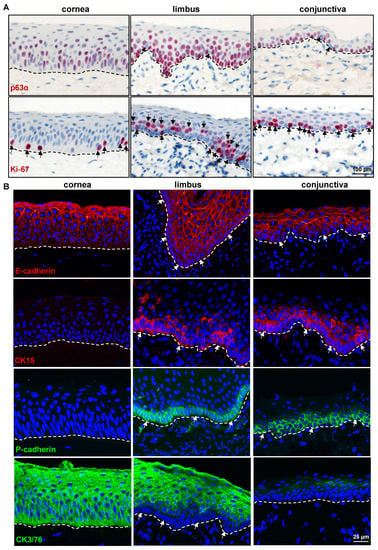 Expression analysis of epithelial-related markers: (A) Immunostaining of corneoconjunctival tissue showing the expression of p63α in the basal layers of corneal, limbal, and conjunctival epithelia, but the stronger expression in the limbus and conjunctiva and a few negative cells in the limbal and conjunctival basal layers (arrows); Ki-67 expression in the basal cells of the cornea, limbus, and conjunctiva (arrows); dashed line represents basement membrane (BM). (B) Immunofluorescence staining of frozen sections showing the expression of E-cadherin in the superficial layers of epithelial cells in both limbus and conjunctiva (red), leaving the basal cells negative (arrows), whereas all layers of corneal epithelium expressed E-cadherin; CK15 expression in the basal layers of the limbal and conjunctival epithelia (arrows, red) but not in the corneal epithelia; P-cadherin expression in the basal layers of limbal and conjunctival epithelia (arrows, green); CK3/76 expression (green) in all layers of the corneal epithelium and in suprabasal cell layers of limbal epithelium but not in basal layers (arrows); nuclear counterstaining with 4′,6-diamidino-2-phenylindole (blue); dashed line represents BM.