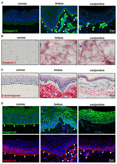 The stem/progenitor cells reside in a specialized microenvironment (niche) that regulates the function of stem/progenitor cells through interactions with the ECM (cell–matrix interactions) and neighboring cells (cell–cell interactions) either directly or through the use of soluble growth and signaling factors []. Previous studies of human limbal tissue demonstrated the presence of a limbus-specific ECM and BM containing collagen (Col)IV, Tenascin(TN)-C, fibronectin, and laminin (LN) isoforms [,,,]. We investigated the presence of these molecules on the porcine ocular surface tissue. The anti-human ColIV antibody strongly stained limbal BM (arrows) and elicited a very weak staining in corneal and conjunctival epithelial BM (Figure 4A), suggesting a pronounced limbal enhancement of ColIV in the pig. The BM of vessels in the limbal and conjunctival stroma also stained for ColIV (arrowheads, Figure 4). Tenascin-C, a subepithelial matrix component, has been found in the corneo-limbal transition zone and demonstrated significantly increased deposition underneath the limbal epithelium in aniridia-associated keratopathy [,]. In the current study, TN-C staining was observed in the posterior stroma (further away from the epithelium) of the limbus and conjunctiva (red) but not in the corneal stroma (Figure 4B), as well as in the anterior stroma of the limbus and conjunctiva []. The other ECM-related antibodies that readily stain the human ocular surface [], such as fibronectin, agrin, LN-α3, and LN-α5, were unreactive to the porcine ECM []. Dystroglycan, a cell adhesion molecule for BM anchorage, forms a critical link between the ECM (mainly laminin α2 chain and agrin) and the cytoskeleton of muscle cells but is also present in non-muscular tissues including the brain, skin, and hematopoietic stem cells []. In the human limbal stem cell niche, dystroglycan was found to localize to the basal cell membrane of LEPC and occasionally also to subepithelial stromal niche cells []. In the present study, the antibody against β-dystroglycan was detected in the basal cell membranes of the limbus and conjunctiva, whereas faint membrane staining was present in the superficial cells of the limbus and conjunctiva as well as the corneal epithelium (Figure 4C). Interestingly, β-dystroglycan staining was prominent in the limbal stroma but weak in the conjunctival stroma and absent in the corneal stroma (Figure 4C). Integrins, ECM-binding cell surface receptors, play a major role in various stem cell niches including the limbal one by guiding stem cell niche architecture, regulating stem cell proliferation and self-renewal to maintain stem cells in the niche, and, finally, controlling the orientation of dividing stem cells [,]. Integrin α3 staining was present in the basal aspect of the corneal, limbal, and conjunctival epithelia, with the limbus and conjunctiva showing a strong expression (green, Figure 4D). The hemidesmosomal integrin α6 occurred in all ocular surface epithelia, with a continuous strong basal membrane staining and a rather weak signal in lateral cell membranes (arrows); it was also present in the vasculature of the limbal and conjunctival stroma (arrowheads, Figure 4D). These findings are comparable to those reported for human ocular surface tissue [,], but for detailed characterization of the ECM of the porcine ocular surface, the unreactive antibodies need to be replaced by antibodies raised against porcine proteins.