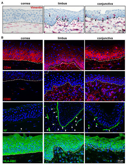 Expression analysis of limbal niche cell-related markers: (A) Immunohistochemical staining of paraffin sections of corneoconjunctival specimen showing the vimentin expression in the stromal cells of the porcine cornea, limbus, and conjunctiva (red); vimentin+ cells in the basal epithelial layers of both limbus and conjunctiva (arrowheads); dashed line represents the basement membrane (BM). (B) Immunofluorescence staining corneoconjunctival tissue sections showing the CD44 expression on the plasma membranes of basal epithelial and stromal cells of the cornea (red) and predominant expression in the limbus and conjunctiva; CD90 expression in the stromal cells of limbus and conjunctiva (red); neurofilament (NF) expression in the stroma of all three surface regions (arrowheads) and in the limbal BM (arrowheads); the anti-human HLA-class I antibody stained all cells of the ocular surface (dashed line represents BM).