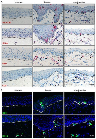 Expression analysis of immune-related markers: (A) Immunohistochemical staining of porcine ocular surface paraffin tissue sections showing the swine leukocyte class II+ cells (detected by HLA-class II antibody) in the epithelial layers and stroma of limbus and conjunctiva (arrows); S100 expression in a few cells of the limbus and the conjunctival epithelial basal layer (arrowheads) and in the stroma of all three regions (arrows); anti-von Willebrand factor (VWF) stained the vasculature of the porcine ocular limbus and conjunctiva (arrows); expression CD4 in a few cells of limbal and conjunctival stroma; dashed line represent basement membrane (BM). (B) Immunofluorescence staining of frozen sections showing the CD1+ cells within the multilayered epithelium of limbus and conjunctiva (arrows) but not in the cornea; CD14 expression in a few cells of the limbal and conjunctival stroma (arrows), rarely observed only in the conjunctival epithelium (arrow); nuclei are counterstained with 4′,6-diamidino-2-phenylindole (blue); dashed line represents the BM.