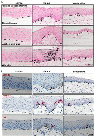 Expression analysis of melanocyte-related markers: (A) Light micrographs of paraffin sections of corneoconjunctival specimen stained with Fontana-Masson showing the melanin in the limbal and conjunctival regions of domestic porcine samples and wild pigs (arrows), whereas there was no melanin in the Aachen minipig samples; dashed line represents the basement membrane (BM). (B) Immunohistochemical staining corneoconjunctival sections showing the SRY-homeobox10(SOX-10)+, human melanoma black(HMB-45)+, and tyrosinase (TYR)+ cells in the basal layers of limbal and conjunctival epithelium; dashed line represents BM.