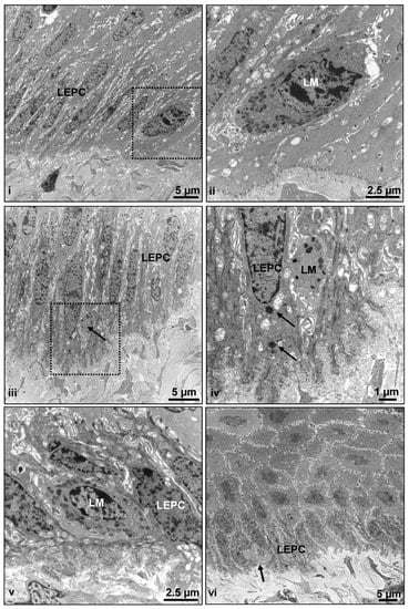 It can also be speculated that at least some of the melanocytes could be resting, non-functional melanocytes, not expressing more differentiated antigens recognized by the anti-human melanocyte antibodies tested. TEM analysis revealed that the presence of basal limbal epithelial cells (LEPC) in association with LM (Figure 8) at the corneo-limbal transition zone (Figure 8(i) (dotted square bracket indicates the melanocyte) and Figure 8(ii)), limbal palisade zone (Figure 8(iii) (arrow indicates melanocyte) and Figure 8(v)), and the presence of melanosomes within the LEPC (arrows, Figure 8(iv)) in only one of the four porcine samples (from slaughterhouse) studied. In other samples, atypical cells in the basal limbal epithelium were occasionally observed (arrow, Figure 8(vi)), without any melanosomes but also without any clear relationship to immune cells, implying that these were atypical melanocytes. Nonetheless, further research is needed to investigate these cells. In addition, genetic analysis of wild and mini pigs would aid in a better understanding of the existence of melanocytes. In total, 41 different antibodies were tested, and 33 of them exhibited immunoreactivity. However, our investigation is confined to the immunohistochemical characterization of the porcine ocular surface. Additional studies on the transcriptomic/proteomic profile of the porcine ocular surface will help in further understanding the physiology of the porcine ocular surface.