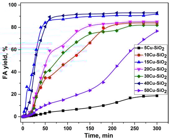 2.1. Furfural Hydroconversion in the Presence of Monometallic Copper Catalysts