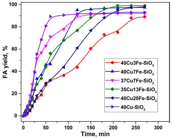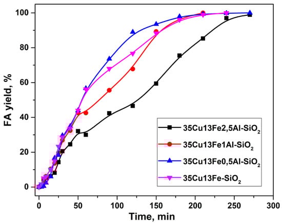 2.2. Furfural Hydroconversion in the Presence of Copper-Containing Catalysts Modified with Iron and Aluminum
