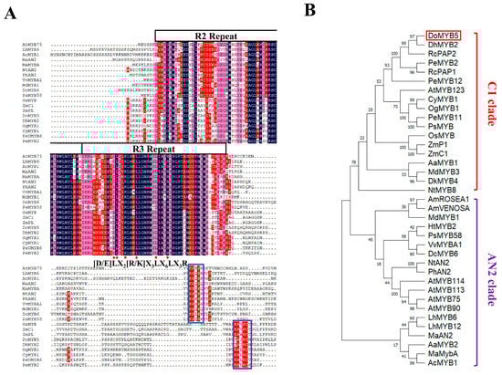 The full-length cDNA of DoMYB5 was successfully obtained by PCR amplification. The ORF of DoMYB5 was 873 bp, encoding 184 amino acids. Amino acid sequence analysis showed that DoMYB5 had a highly conserved R2R3 domain at the N-terminal. A protein core characteristic sequence interacting with the bHLH transcription factor, [D/E] LX2 [R/K] X3LX6LX3R, was found in the R3 domain of DoMYB5. A conserved motif related to anthocyanin regulation, KAX [K/R] C [S/T], was found in the C-terminal region of DoMYB5 (Figure 2A). Phylogenetic analysis showed that DoMYB5 and other MYBs that promote anthocyanin synthesis were grouped into one group (Figure 2B).